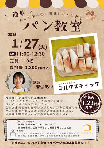 パン生地を作ってお持ち帰りいただきますので、ご家庭で焼き立てパンをお楽しみください♪